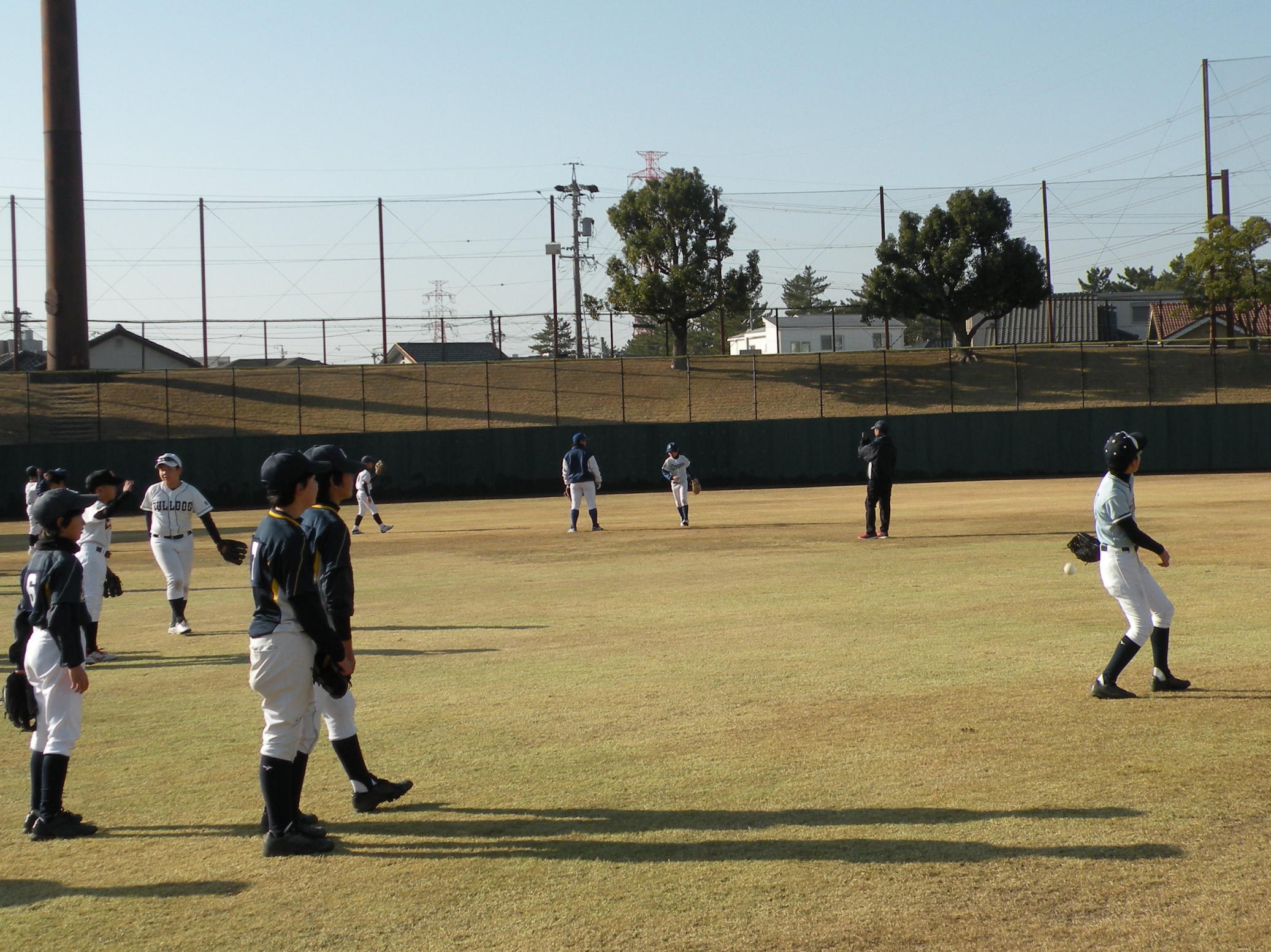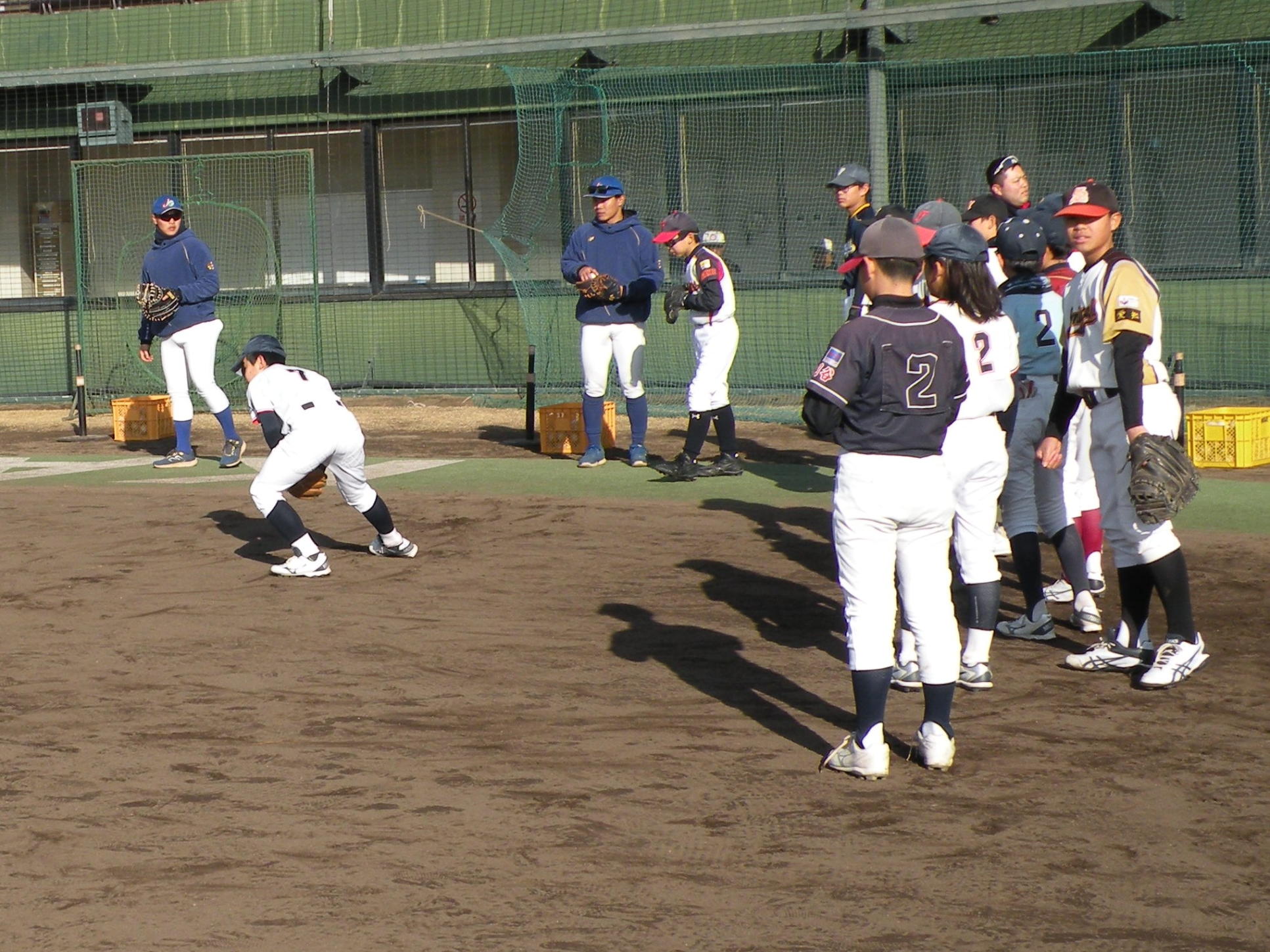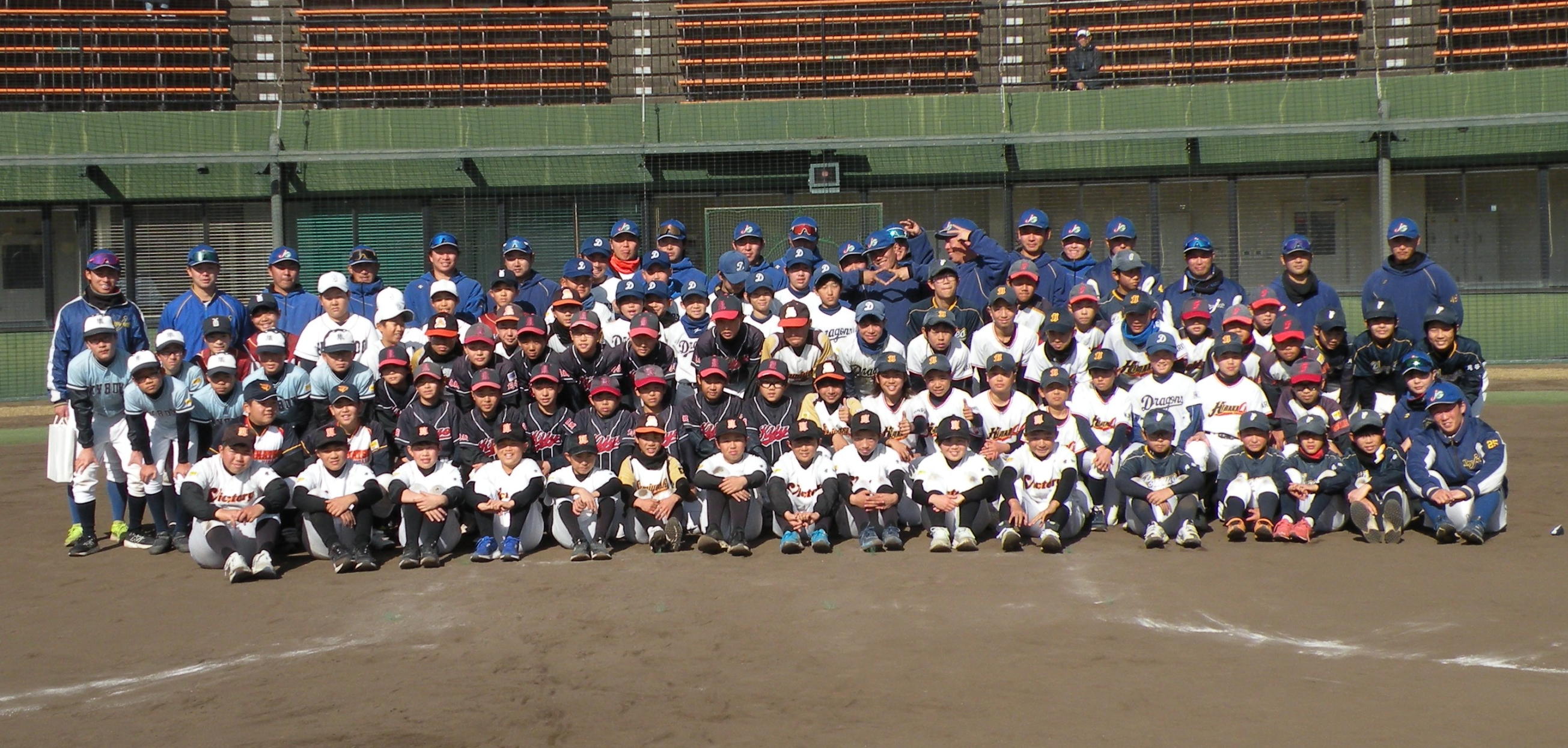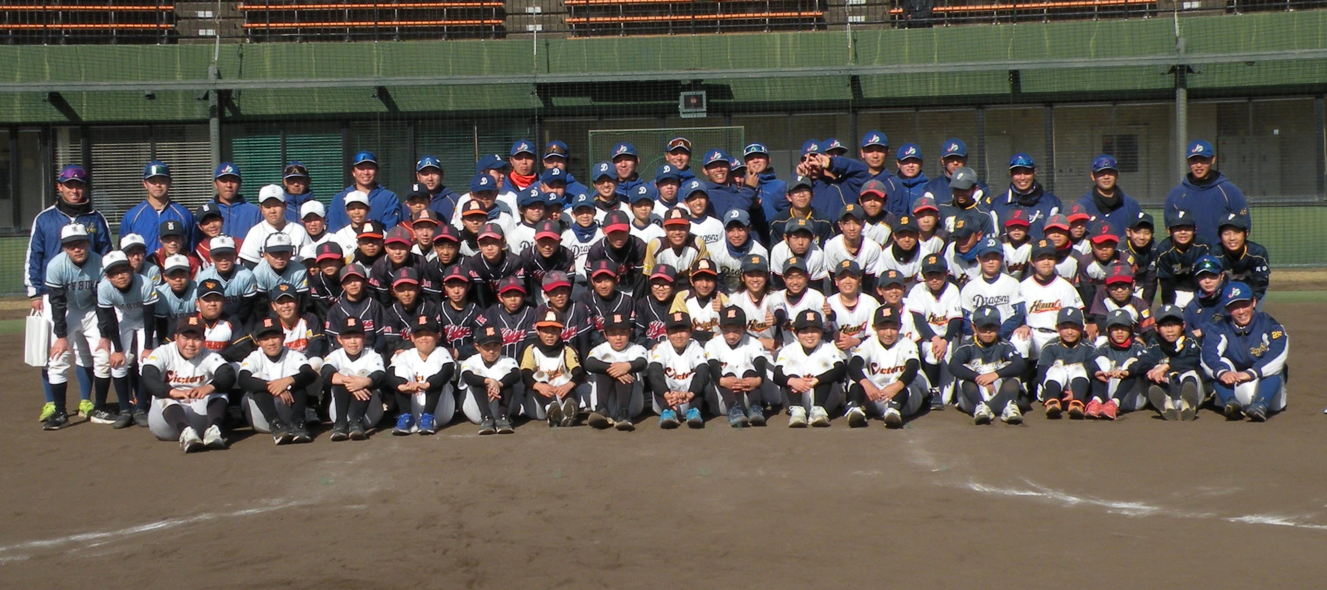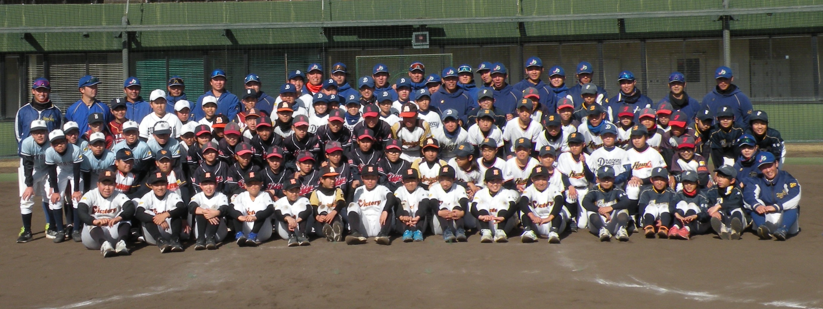 ことしは、野球日和?の中、刈谷球場で、Jプロジェクト硬式野球部による野球教室が行われました。 9時より野球教室開校式を行い、その後3グループ(投手・捕手のバッテリーグループ 内野守備グループ 外野守備グループ)にそれぞれ指導者とともに分かれ、準備体操、投球、捕球、内野守備、 外野守備、打撃及び走塁練習を、11時迄まで行われました。 最後に、グループ別に分かれ(6チーム)て、ティーバッティングゲームで盛り上がりました。 参加したのは、刈谷市の少年野球11団体の6年生約80人です。 指導してくれたのは、ジェイプロジェクト硬式野球部(社会人野球)の選手約25人です。 短い時間で有ったけど、子供たちは元気に楽しく、選手と和気あいあいで、貴重な時間であったと思います。 |