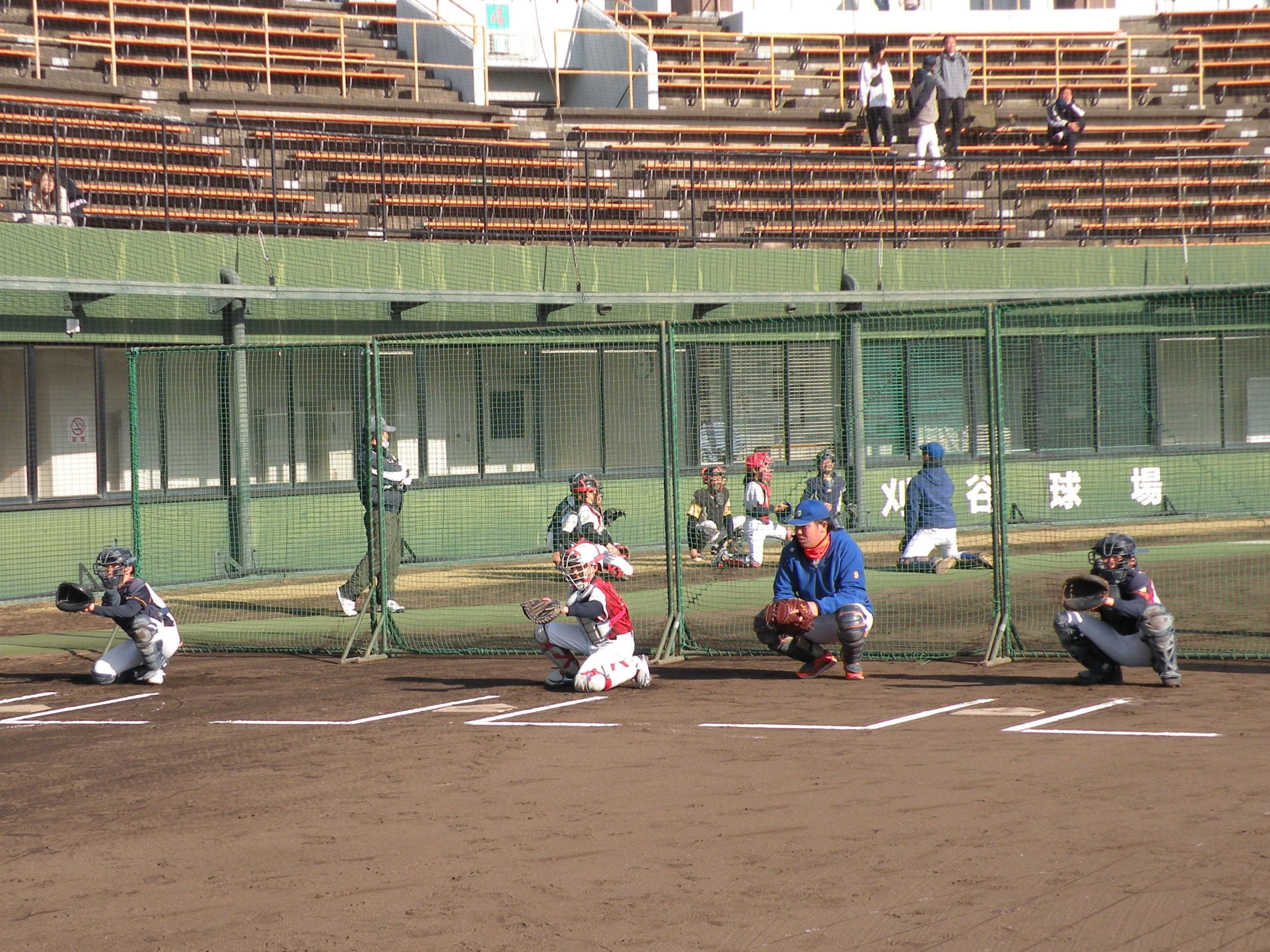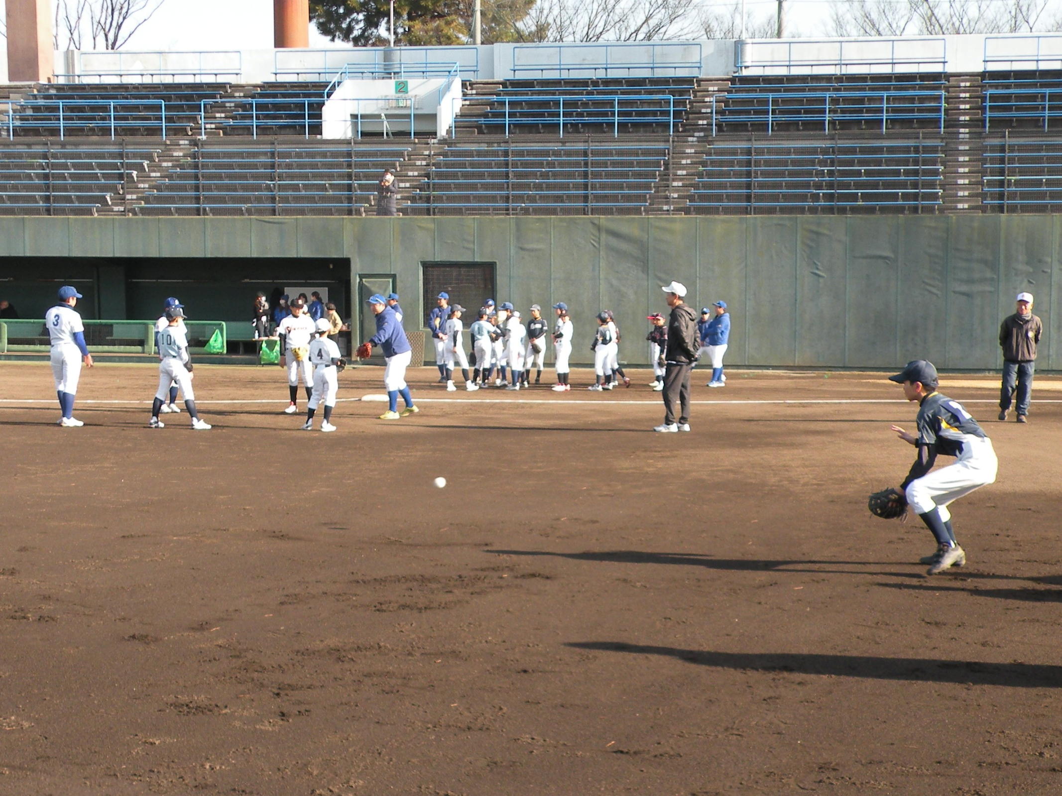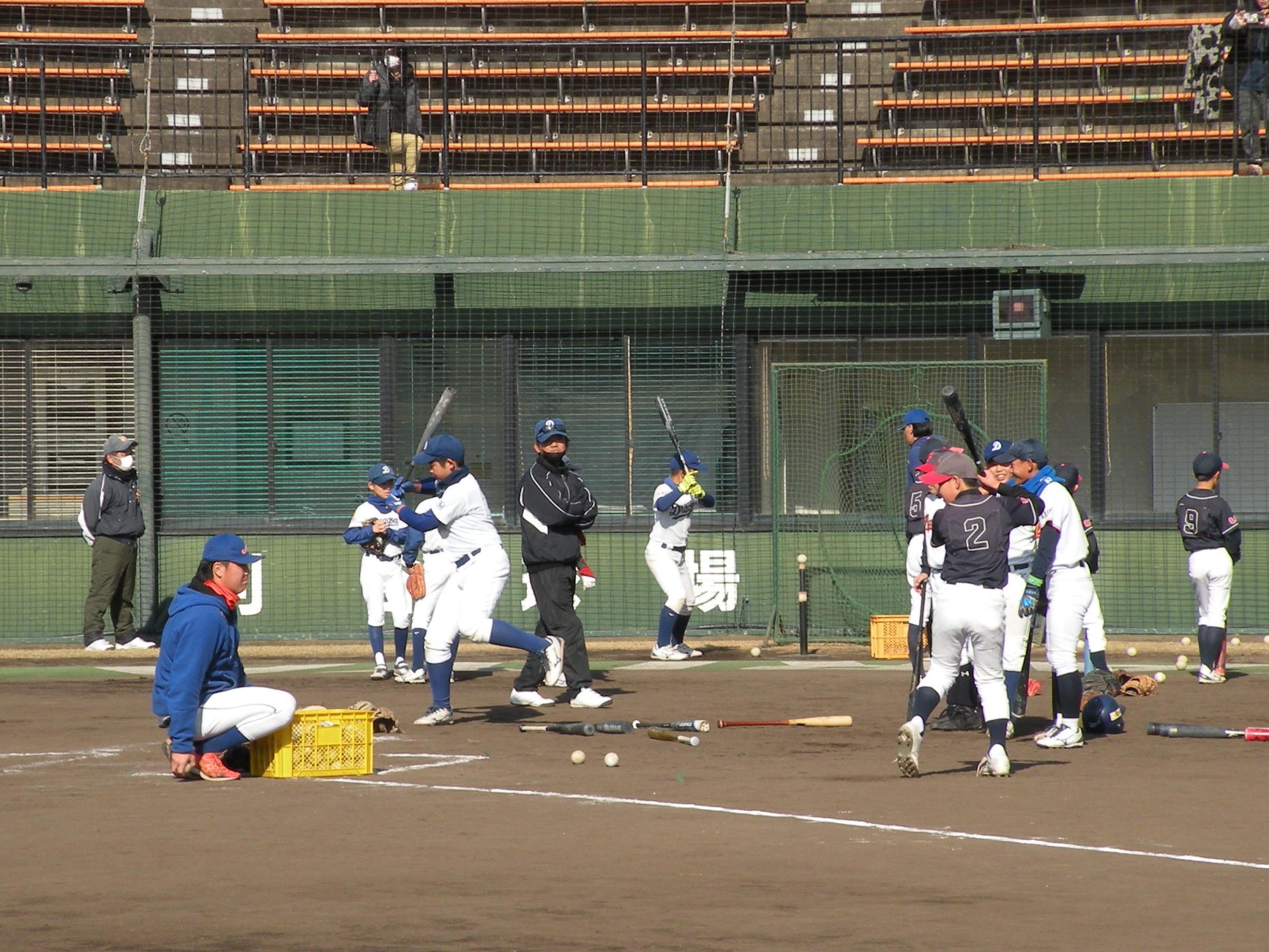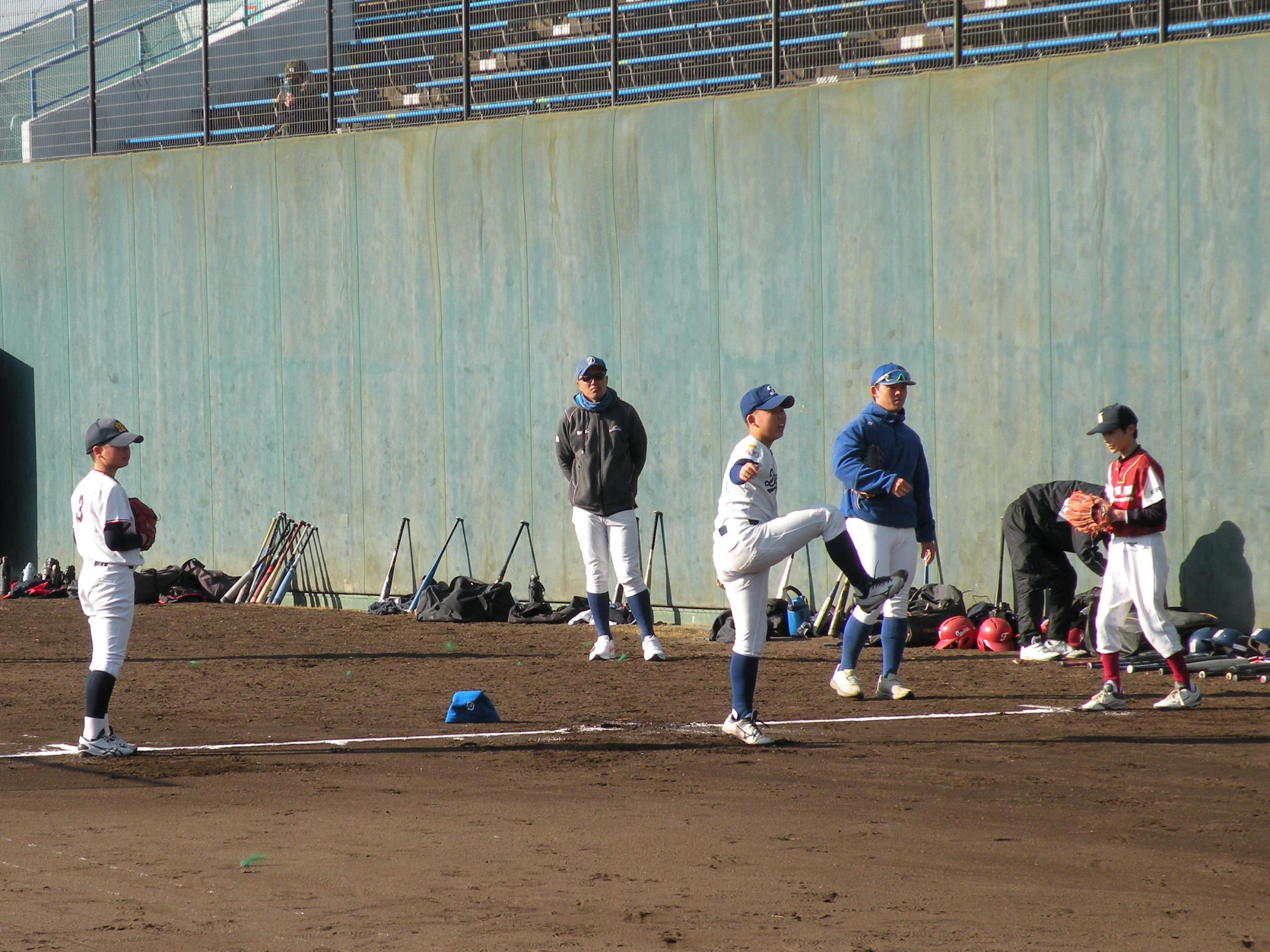 ことしは、野球日和?の中、刈谷球場で、Jプロジェクト硬式野球部による野球教室が行われました。 9時より野球教室開校式を行い、その後3グループ(投手・捕手のバッテリーグループ 内野守備グループ 外野守備グループ)にそれぞれ指導者とともに分かれ、準備体操、投球、捕球、内野守備、 外野守備、打撃及び走塁練習を、11時迄まで行われました。 最後に、グループ別に分かれ(6チーム)て、ティーバッティングゲームで盛り上がりました。 参加したのは、刈谷市の少年野球11団体の6年生約80人です。 指導してくれたのは、ジェイプロジェクト硬式野球部(社会人野球)の選手約25人です。 短い時間で有ったけど、子供たちは元気に楽しく、選手と和気あいあいで、貴重な時間であったと思います。 |