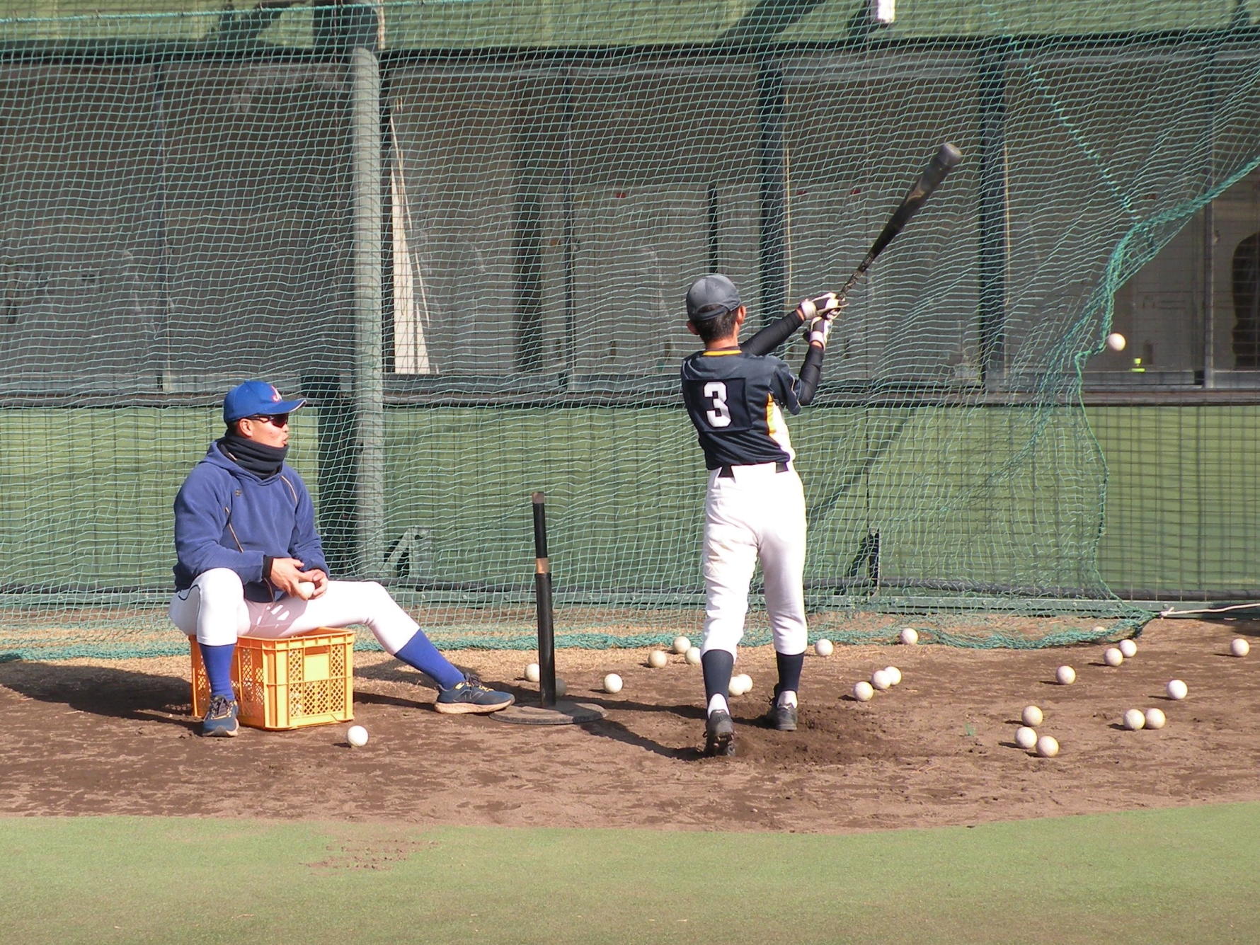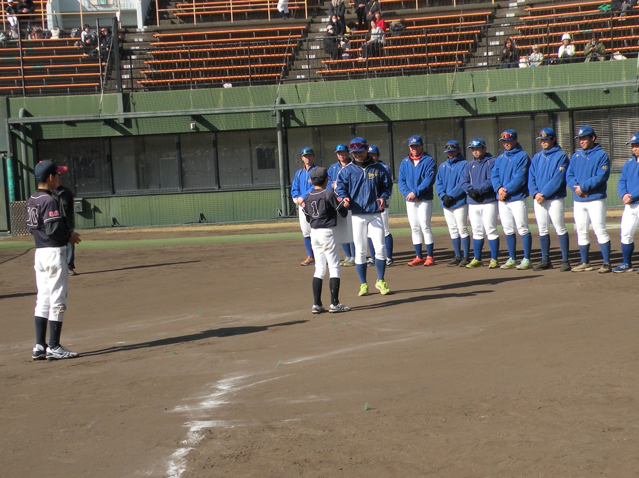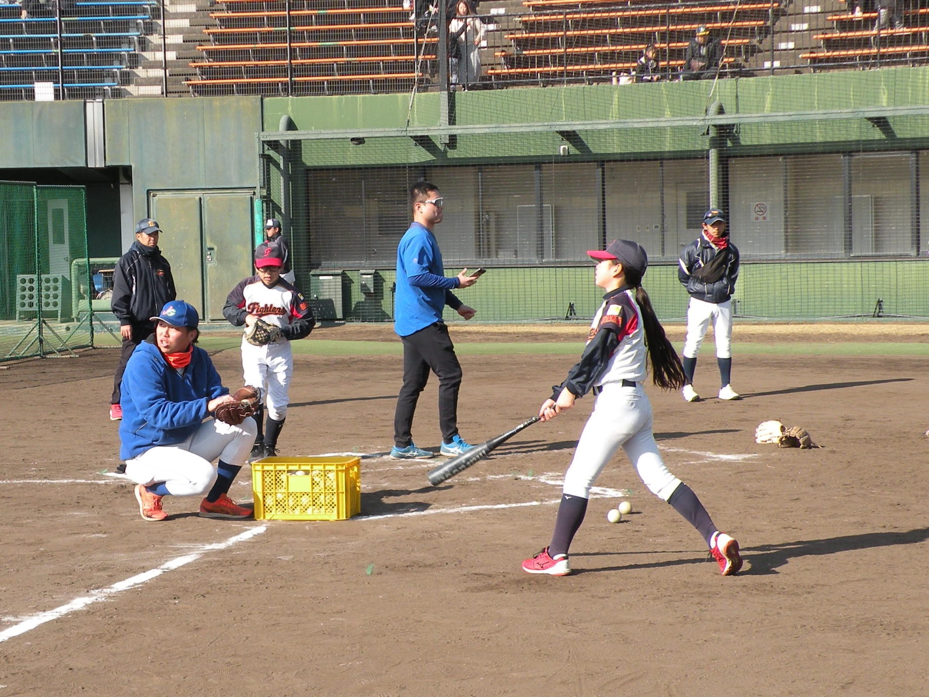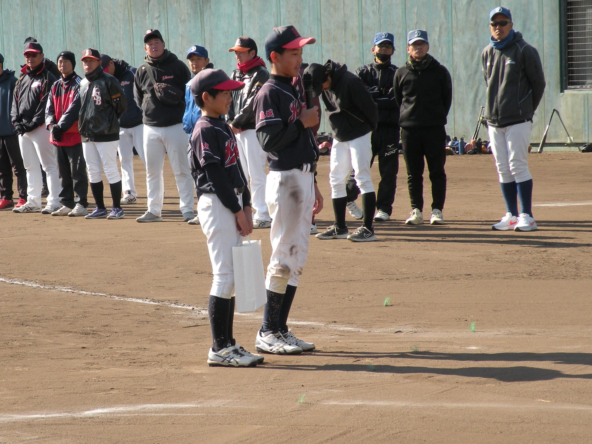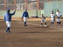 ことしは、野球日和?の中、刈谷球場で、Jプロジェクト硬式野球部による野球教室が行われました。 9時より野球教室開校式を行い、その後3グループ(投手・捕手のバッテリーグループ 内野守備グループ 外野守備グループ)にそれぞれ指導者とともに分かれ、準備体操、投球、捕球、内野守備、 外野守備、打撃及び走塁練習を、11時迄まで行われました。 最後に、グループ別に分かれ(6チーム)て、ティーバッティングゲームで盛り上がりました。 参加したのは、刈谷市の少年野球11団体の6年生約80人です。 指導してくれたのは、ジェイプロジェクト硬式野球部(社会人野球)の選手約25人です。 短い時間で有ったけど、子供たちは元気に楽しく、選手と和気あいあいで、貴重な時間であったと思います。 |