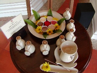 ◆アロマ・スパ◆ この日は、雨で天気が悪かったので、ホテルでスパを体験することに。 バニアンツリーと同じスパで、話題にもなってるこのスパ。サービスは文句なしでした。 トモが、アロママッサージ&タイ式マッサーで、くすぐったがりの私はフェイシャルマッサージに決定。 まずアジアンムードいっぱいのオシャレなコテージに案内され、素っ裸に・・・ そしてバスローブを来て、いざマッサージ。 トモは、マッサージ初体験で、やや緊張!しかも男の大事な物を、女性スタッフに見られるハメに・・・ と言いながら、結構楽しんでたみたい。私の肌もツルツル!