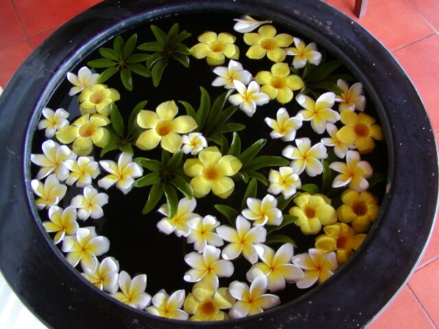 ◆タイのお花◆ アジアのホテルのいいところって、ホテルの至る所でかわいいお花をいっぱい見ることが出来るところ。 ロビーに左下のつぼが置いてある。この中には毎日違うお花が水に浮かべてある。 毎朝、係の人がいろいろなお花を浮かべているようで、「今日はどんなお花かな?」と思いながらロビーを通るのも、このホテルの楽しい日課でした。その他にも、右下のような鮮やかな色のお花がお庭にいっぱい咲いていて 心を癒してくれます★