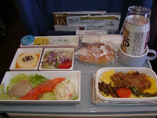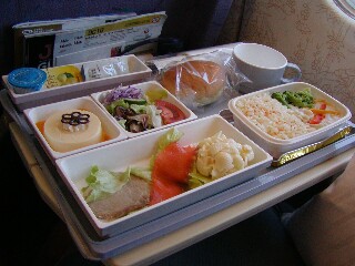 ◆機内食◆ 離陸1時間後、待ちに待った(トモが)機内食だわ♪ とりあえず、カップルの基本として選んだメニューはそれぞれ違うもの。 右が私が頼んだホワイトグラタン。左がトモが選んだ鳥のテリヤキ丼 おいしかったのは、鳥のテリヤキの方で、私がトモの分半分食べちゃった・・・