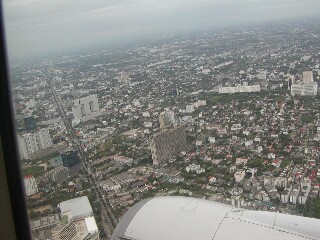 ◆空の上◆ 6時間の雲の上の旅のあと、やっとバンコクの町が見えてきたわー 町は想像した通りの都会。変わった形のビルが多いのが気になった。 そして、バンコクに到着!この日のバンコクは曇り。思ったほど気温も高くなくなかった。 バンコク空港は、とにかく広ーい!搭乗口が73まであるから、乗換時間が20分しかなかった私達は ちょーダッシュ!