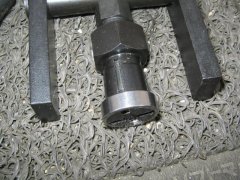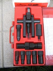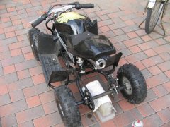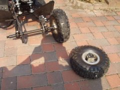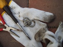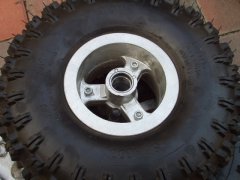 Goto Family Home Page - Enjoy Motor だんだんはまってきた中華ATV 近所の空き地だの、矢作川の河畔だので、週末毎に子供たちとはまっております。ウィッシュのカーゴに収まるので、移動には便利です。でも、車内に充満するガソリン臭で、子供たちがクルマに酔ってしまうように…。またまた問題発生!! 大惨事になるところでした。例のごとく、空き地で乗り回していたところ。上の子が、ドリフトで格好よくストップをかけたところ、ポロリとリアのタイヤは外れてしまいました(まるでチキチキマシーンのように…、古い!) ![]() どうも、ホイールをとめていたボルトが緩んでいたようです。購入時に一応の増し締めは施したつもりではいたのですが、走行でだんだんと外れてきたみたいです。でも、よく見ると外れ方が変。どうもホイール中央部にはまっている車軸ベアリングが焼きついています。反対側と見比べてみると、ボルトが緩み、ベアリング部の側方の押さえが効かなくなって、焼きついたというより、ベアリングはバラけて、変磨耗してしまったようです。 ![]() 組み直そうとトライしましたが、ベアリングの復旧は難しそうです。とうとう補給部品の壁にぶち当たる時が来たようです。さて、Mini Quadardのスペアパーツは、いったいどこで入手できるのでしょうか。乞うご期待! 061029 バラしたベアリングの種類を調べてみました。「単列深溝玉軸受」の、「6000Z」と呼ばれるベアリングらしいです。まったく一般的なベアリングらしいので、いろんな購入先があることが分かりました。 しかしながら、お恥ずかしい話、ホイールベアリングの構造的な必要性が今ひとつ理解できないでいます。チェーンを介してスプロケットが、リアのドライブシャフトの外皮パイプに伝達され、それがホイールを駆動するのですが、締め込みしているナット自体は、シャフトのインナーパイプと接着固定されていて、ナット自体は回転はしない、という構造なんですよね。詳しい方、教えてください。 ![]() インターネットで注文して、ようやく届いた6000Zのベアリング。壊れたのは1箇所だけですが、いちおう予備にと4個入手。そしていざ交換!しようとしましたが、ホイールに残っているベアリングのハウジングが、ドライバー等でこじるだけではうまく外れてくれません。 これまたいろいろインターネットに厄介になって調べまくり、近所のバイク屋さんにも教えを請い、どうもベアリングプーラーという特殊工具が必要だ、ということが分かりました。インナータイプが必要で、これはなかなか借りられるところが見つかりません。 岡崎にあるアストロ工具さんのプーラーが何とか使えそうだ、という結論にいたり、現物を持って248号線沿いの営業所に走る。金欠だったため、在庫だけ確認。「いつか買いに来ますから…」とお店を後にしました。061110 ![]() これがウワサのベアリングプーラーです。さすが、専用治具、いままでの苦労がウソのように、あっさりポンッ!とベアリングは外れてしまいました。 そしてそそくさと用意してあった新品のベアリングを、同径のナットソケットで叩き込みます。めでたくベアリング交換終了しました。そしてホイールナットを復元、早速試運転とばかりに、エンジンをかけようとすると…。 ![]() どうにもエンジンがかからないのです。約2ヶ月ほどエンジンをかけずに放置していたので、燃料系がやられちゃったのかなあ、と。キャブの洗浄なんて、久しくやったことないし、で途方に暮れてます。061125 Copyrights (C) 2006S.Goto All Rights Reserved. |