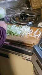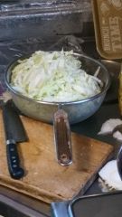 1.白菜を5ミリ幅ぐらいでざく切り、長さは10センチぐらい。油揚げも同じく5ミリ幅でカット。
