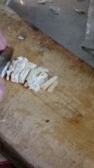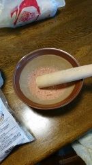 3.かつお節をすりこぎで細かく粉末にしたものを準備。茹で上がった白菜、油揚げはザルで水切り。