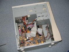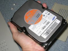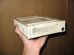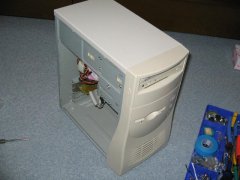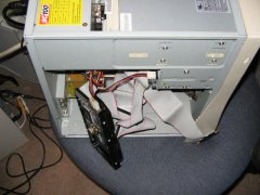 確かこのパソコン、Faithさんの、当時の格安モデルだったかと思うのですが、ハードディスクがリムーバブルケースに収められています。格安モデルにしては妙に部品に奢っている感じで、もしやコイツが悪さを、という気がしてきました。ハードディスクのケーブルをマザーから切り離し、CD-ROMだけをプライマリーに接続して、再度起動してみます。 案の上、CD-ROMだけならプライマリー側で認識できました。ハードディスクでなく、マザーの問題でもないとなると、いよいよこのリムーバブルケースが怪しくなってきました。そこで、リムーバブルケースからハードディスクを取り出して、直接接続で確認してみます。よい子は真似しちゃダメダメの、ハードディスクぶら下がり起動をやってしまいました。