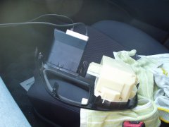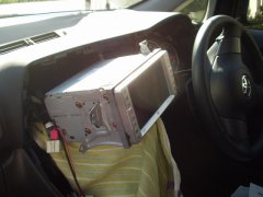 ETC本体は長方形の箱型。ウイッシュのどこに装着するかをまず決めなければなりません。オーディオ部下の物入れボックスに中に純正は装着しているようだったので、同じ方法にトライしてみました。ボックスの底面が浅く、そのままではETC本体が干渉して出っ張ってしまうため、一部切断する必要があります。まずは緊張しながら、コンソールパネルを取り外し(新車だも…)、ボックスを抜き出しました。