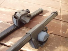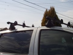 なんとなく車に傷がつきそうな形状の金具で心配ですが、無事取付完了。ルーフがかなり丸っこくて、水平が出ていない感じで、視覚的には格好よくはないですね。040108 |