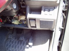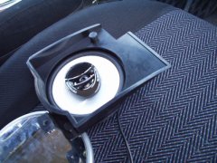 取付は困難を極めました。セイフティパッド全体を取り外すのは面倒だったので、助手席コンソールボックス、ステアリング下のカバーを外して、横から作業で挑みました。助手席は何とかスピーカーを直接取付。運転席は「こんなん、どうやってつけるんじゃい!」な状況。よくよく覗き込むと、どうもスピーカー取付の基台を噛まして取り付けられている様子。まずこの基台をどうにかこうにか取り外しました。しかしこのスピーカー&基台ASSYがどうにも収まらない。セイフティパッドを力任せにひん曲げて、無理矢理に押し込んでしまいました。もう少しでコーンを破ってしまうところ、冷や汗…。そしていよいよ視聴。う〜ん、チューニングに励みます。