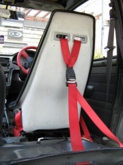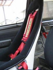 5月3日(火) 内装もすっかりシンプルになったところで、準備してラゲージに放り込んであった、バケットシートに換装してみます。前車から流用の赤いサベルトも装着してみました。リクライニングできないこと、いまひとつシートの剛性がないこと以外は、私レベルのドラテクでは十分満足できる仕上がりです。まあまあ、何より雰囲気ですから。しっかり、ノーマルシートベルトも残してあります。