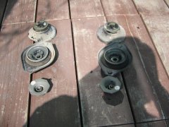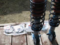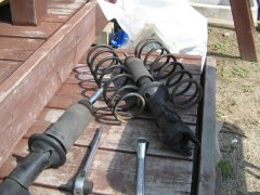 装着した後、バンプラバー(別名「コンちゃん」ともいう)取付を忘れていて、もう一度取り外すハメになんていう、お茶目なチョンボもありましたが、無事取り付け完了。リアは、フロントよりずっと楽にというのが定説ですが、あいかわらずナットが硬くて緩まず。例の柄の長〜いレンチも、フェンダーが邪魔してうまく機能できず、です。ホイールナットレンチをエクステンションしてようやくナットが外れました。マフラーがデフ下なので、マフラーマウントを外してしまうと作業が楽。続けてジャッキをロッドにかまして、スプリングの収まりを調整するのがコツでしょうか。無事交換完了、でも結局3〜4時間はかかりました。