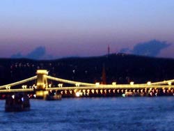 ライトアップされた 「くさり橋」 全長約300kmドイツからオーストリア、ハンガリー、ルーマニアを抜けて黒海に流れるドナウ川ドナウの川風を感じながら2時間のクルーズくさり橋のライトアップの夜景が格別すばらしく感じた。 |