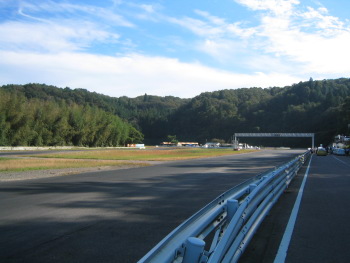 走行前でみなさんボンネット内のチェック中?/1コーナーから駐車場方面を臨む・・・