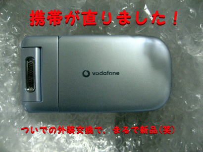 「携帶電話復活!」 年末に壊れた携帶電話が、遂に修理から帰還!!! 電源の不良も治り、メモリも無事でしたぁ〜! とにかく、ホッとしました。そして今回の事件で メモリバックアップの重要性を痛感させられました。 携帶電話なしでは回らない世の中に なってきているんですね〜( ̄▽ ̄;) 副産物的に良かった事がもう一つ! 外装がボロボロだったので、修理に出すついでに 外装交換もお願いしたんです。ハコ換えね(笑) そうしたら右の写真のように、新品みたいになって 返ってきました!しかも毎月払っていた保険により 修理代金は全部では840円だけ!!! 何か得した気分になってしまいました! でも、機種を新しくする機会を逸した気もします(汗) |