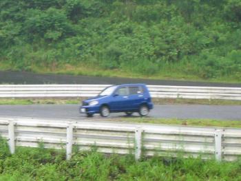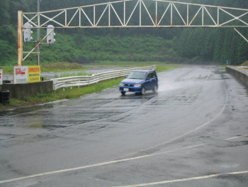 サーキットへ到着し見てみると、やはりかなりのウェットコンディション。 EPおかもとさんがちょうど帰るところで、路面状況を聞いたところ「コーナーのIN側は水がたまってるので気をつけて」というアドバイスをいただきました。来ている車もまばらで、13時〜の枠で走ったのも僕たち2台だけ。逆に気楽に走れたのですが・・・