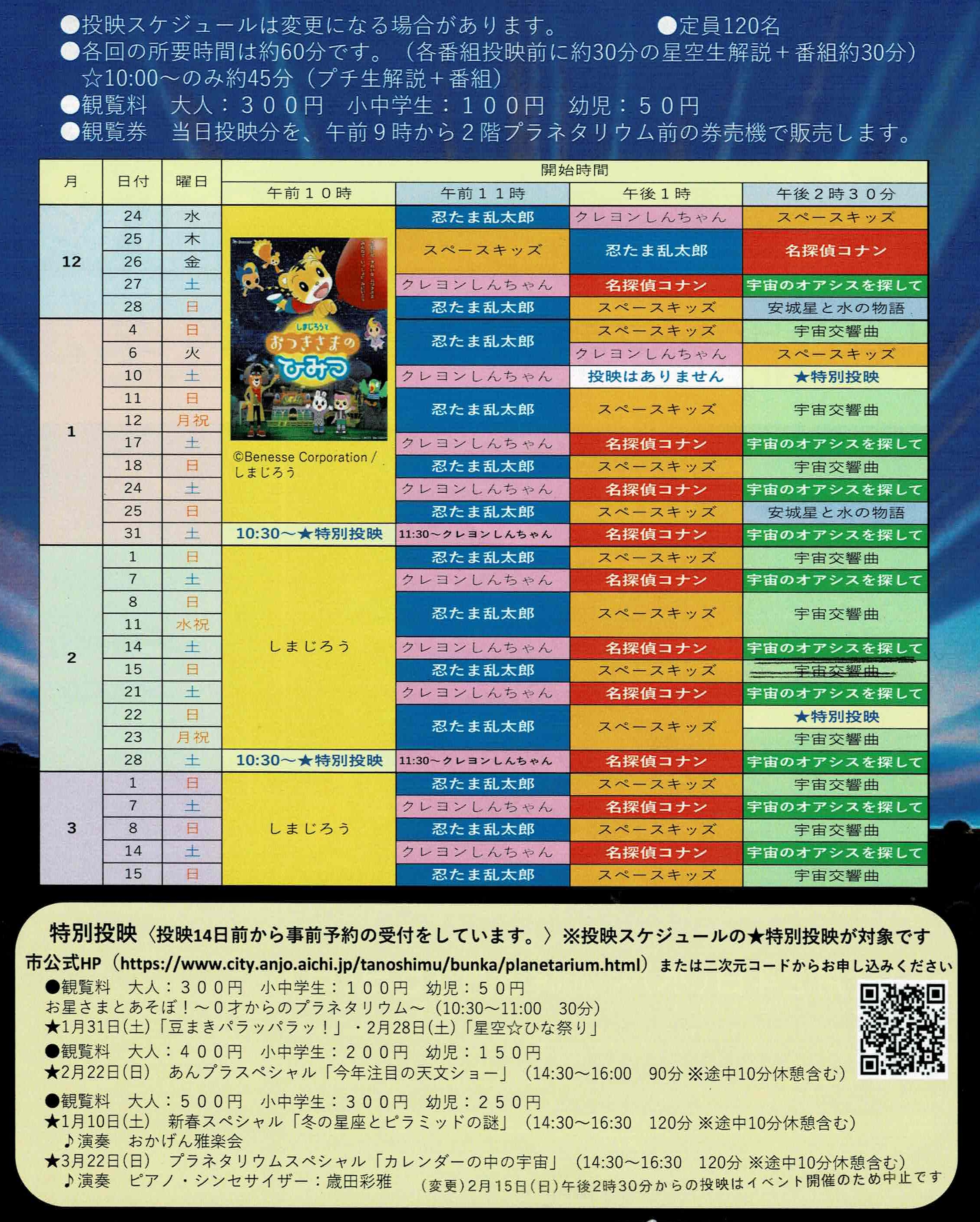 | ご注意 | ・日曜日が祝日の場合は日曜の投映スケジュールになります。 | |||